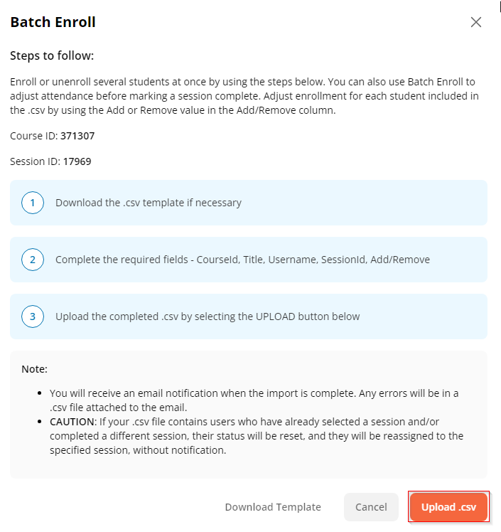 Previously, when a session had ended, the author would need to add students who joined late, or remove students who did not attend, one-by-one before marking the session complete. This is a time-consuming process for sessions with a large number of students. As a course session author, you will now be able to update the enrollments in a specific session by importing a .CSV file of all students who attended a session.
