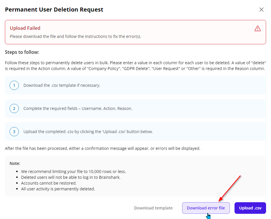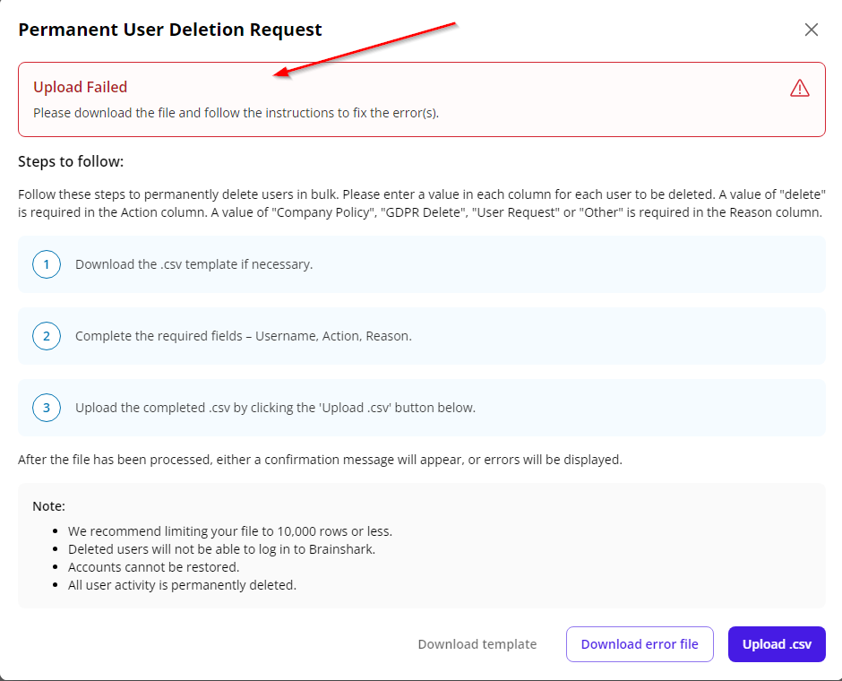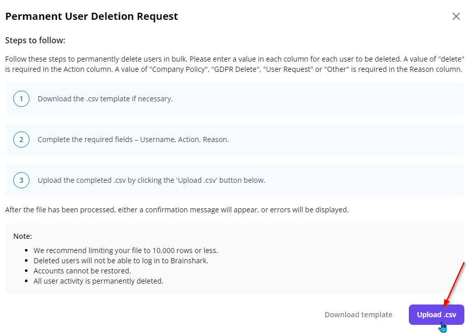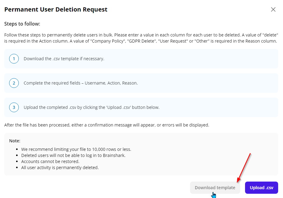 In the reason column, you must enter a value of “Company Policy”, “GDPR Delete”, “User Request”, or “Other” for each row.