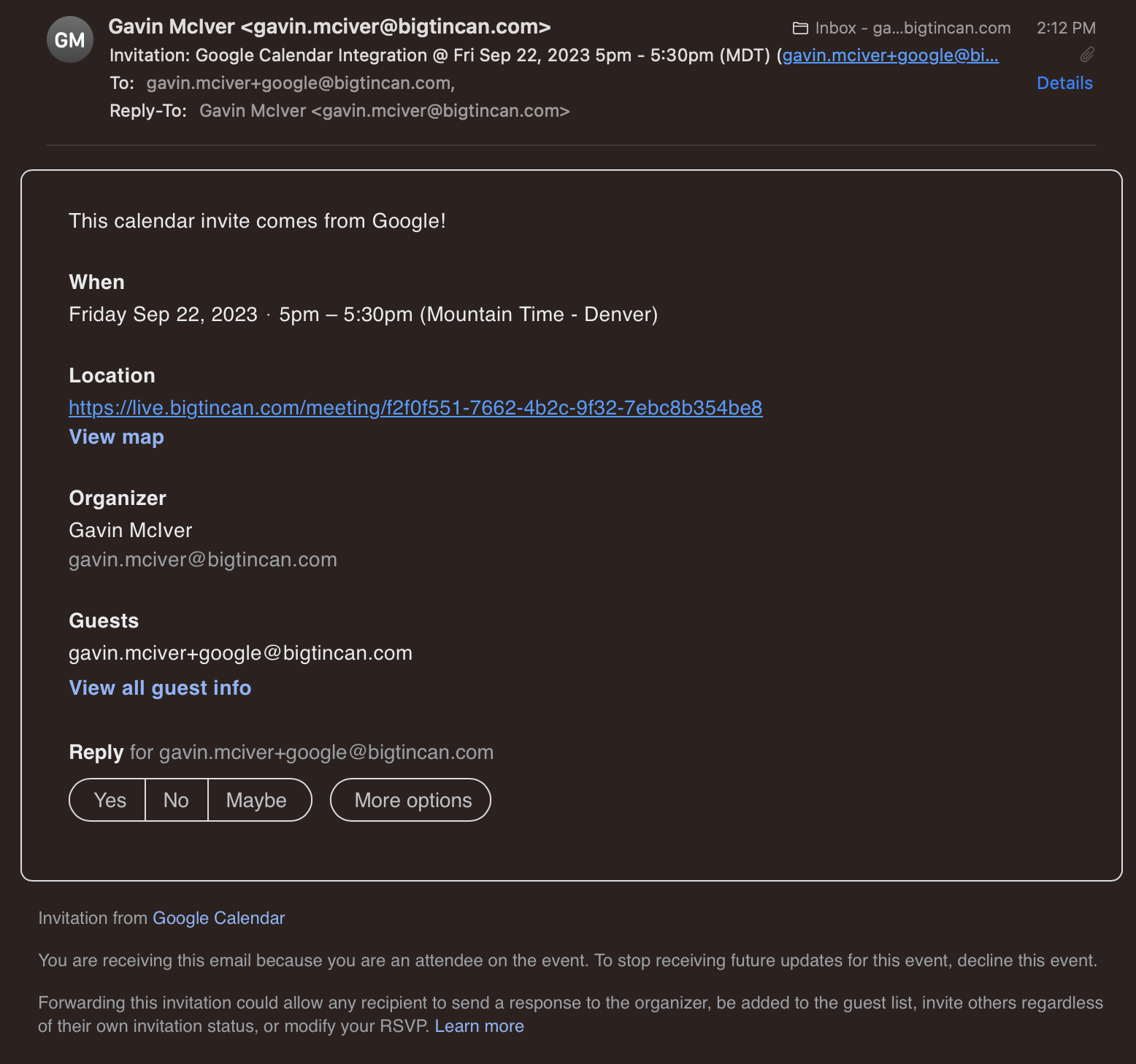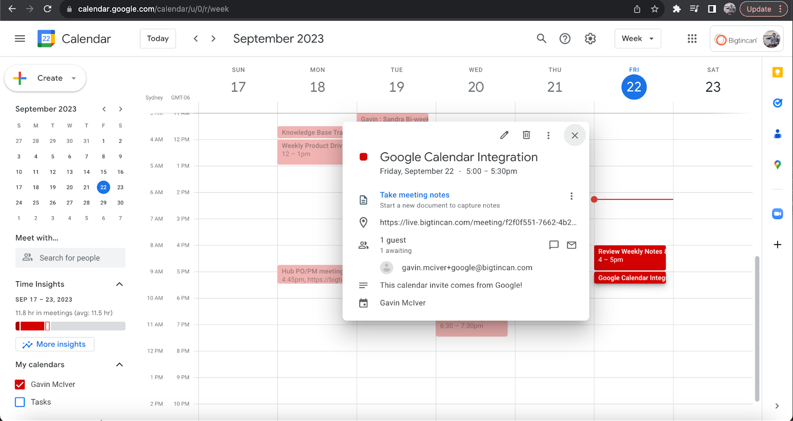 - Any guests that you invite to the meeting will receive a calendar invitation from Google including all of your Bigtincan Meeting details.