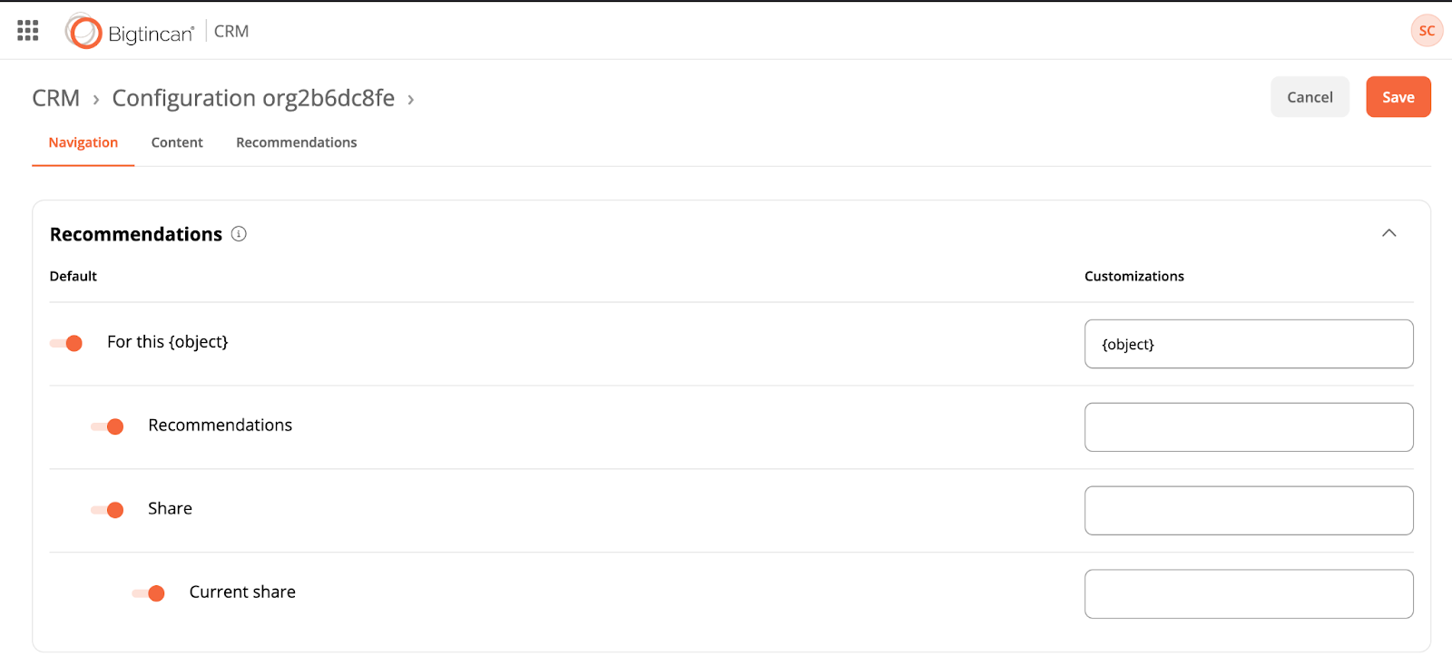 - In the Configuration area you are able to toggle on and off different labels and areas to show up within Dynamics. This is broken out into two different sections, Recommendations within Dynamics and Company Content.