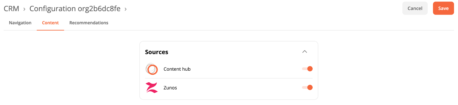 - Under the Content Tab you will be able to select Content Hub and/or Zunos for sources