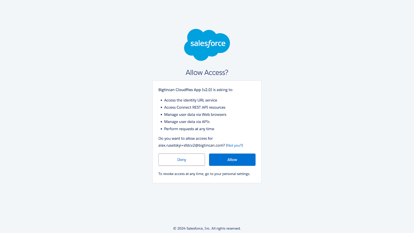- Follow the prompts and login to your Salesforce account. It may require you to provide consent to the Bigtincan app (if the admin has not already done so on behalf of the organization).
