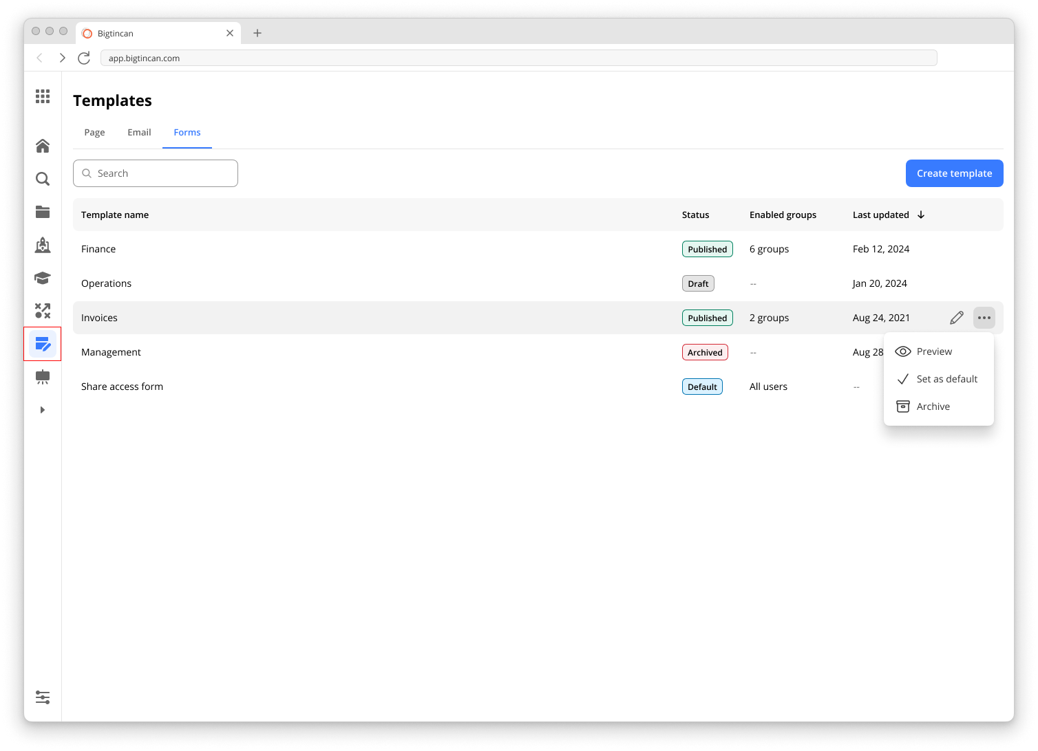 The Forms Dashboard, located in the Main navigation menu on the left side of the screen, allows users to see all Forms that have been created in your tenant. Users can view the list of Forms (sorted by last created date by default), search Forms by their title, and Sort by status, groups, or last updated date.