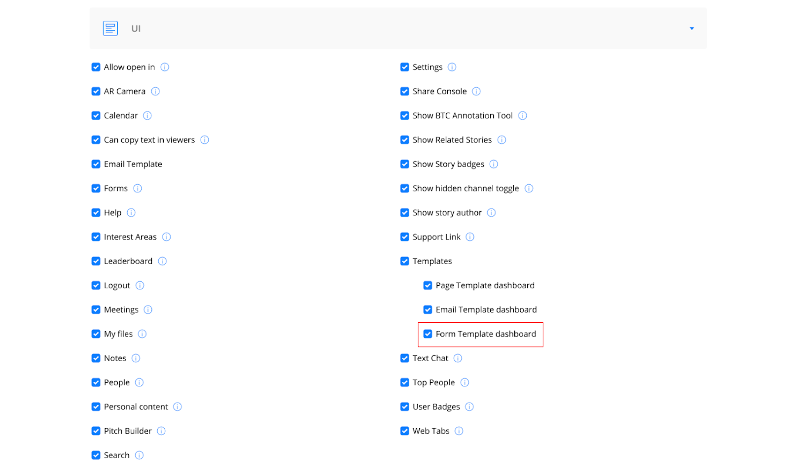 The use of a Form when sharing content is managed at the individual Form level in the Form Dashboard. Forms use Group permissions to determine who has access to use or edit each Form.