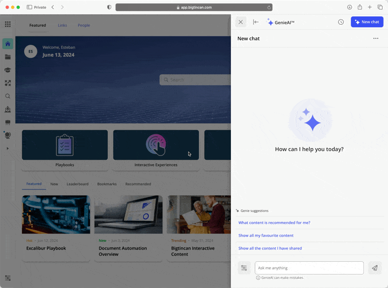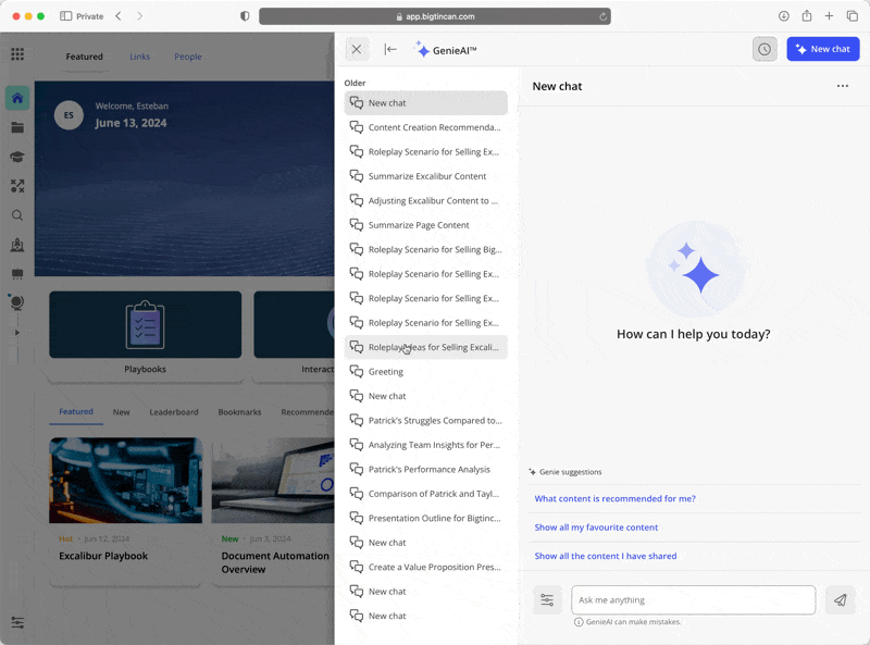 Users can access previous chats with Genie via chat history. If you are having trouble finding Genie Assistant see here for the different locations.