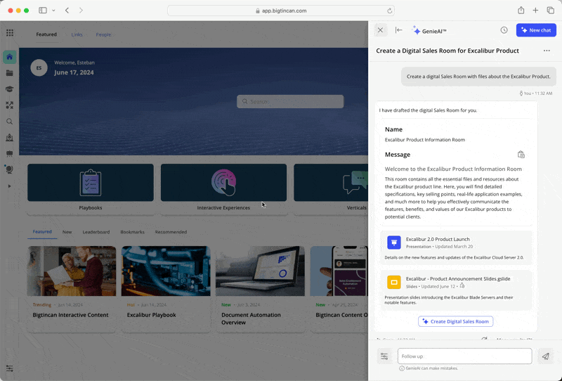 - Genie responds with a draft name and message that includes a button for copying the generated text, and an action button to Create a Digital Sales Room.