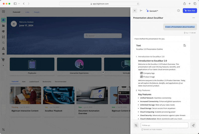 - Genie responds with a draft presentation outline that suggests slide content, slide notes, and images relevant to the topic.