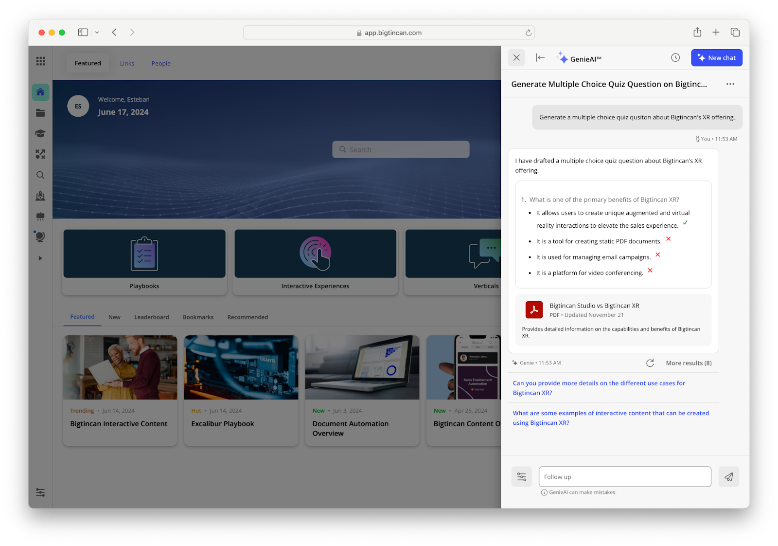 - Generate a multiple choice quiz question about Bigtincan's XR offering.