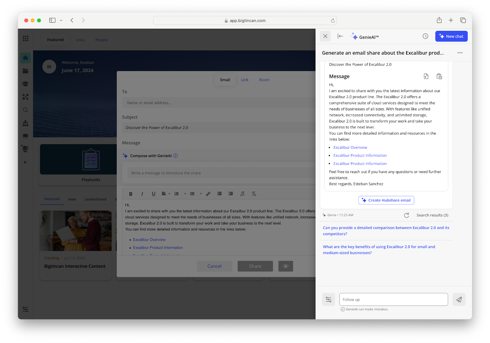 - Genie responds with a draft email subject and message that includes a button for copying the generated text, and an action button to Create a HubShare Email.