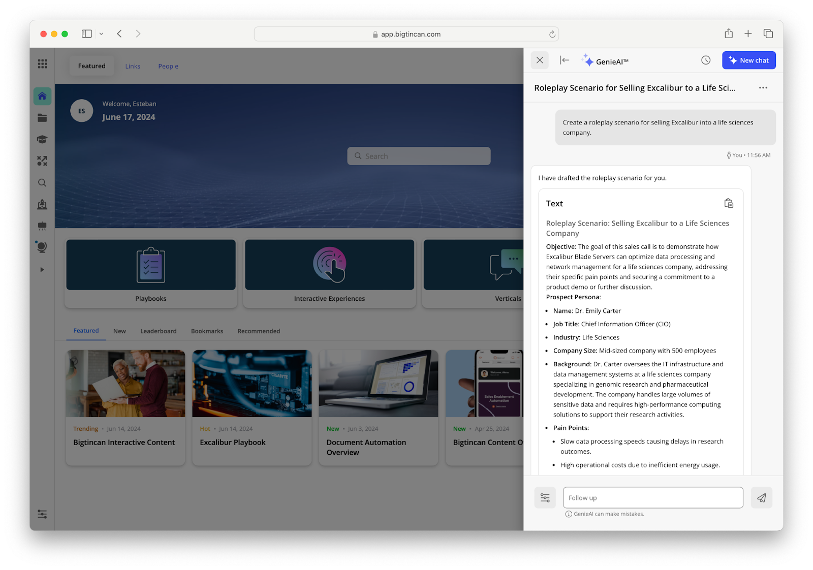 - Genie responds with a draft roleplay scenario outline that includes information about a prospect persona, background, pain points, scenario context, objections, suggested objection handling, dialogue prompts and success criteria.